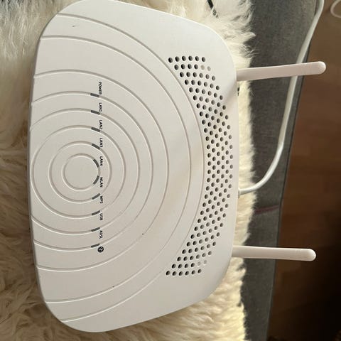 D-Link reititin, valkoinen väri, sisältää virta-adapterin ja kaksi ulkoista antennia. Käytettävissä langattomaan verkon jakamiseen kotona tai toimistossa.