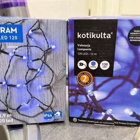 Molemmissa on 10 lamppua. Airam Nook 3 kpl AAA-paristoja ja merkittömään 2 kpl AAA. Paristot eivät kuulu kauppaan.