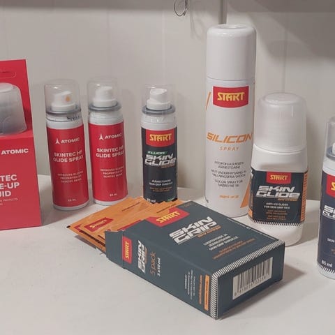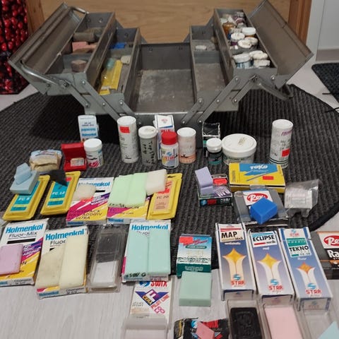 Kolme eri suksivoidetta erilaisille pakkasäille sekä voiteiden levitys- ja poistotarvikkeita. Osa käyttämättömiä.