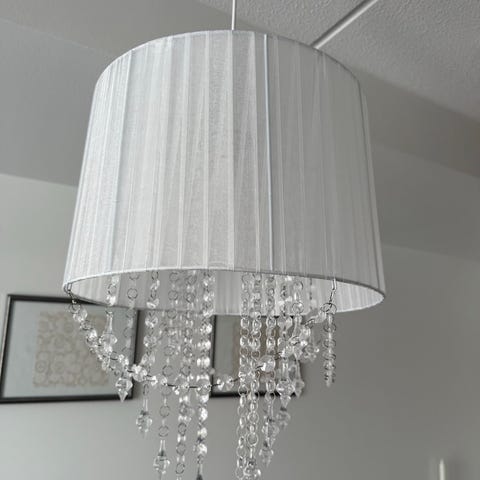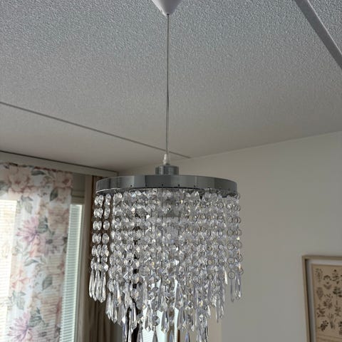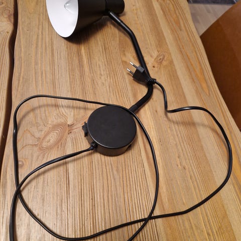 Töpseliliitin kuuluu valaisimeen, ilman lamppua. Johdon näkyvä osa on lyhennetty n 30cm mittaiseksi