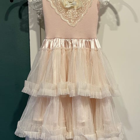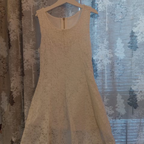 Model Behaviour merkkinen vaaleanpunainen pitsikukka kuvioitu juhlamekko. Kaunis ja lähes käyttämätön. Yhden pienen tahran löysin hameesta, mutta en ole kokeillut sen poistamista. Luulen että lähtee helposti. Ei vaikuttanut hankalalta irrottaa.