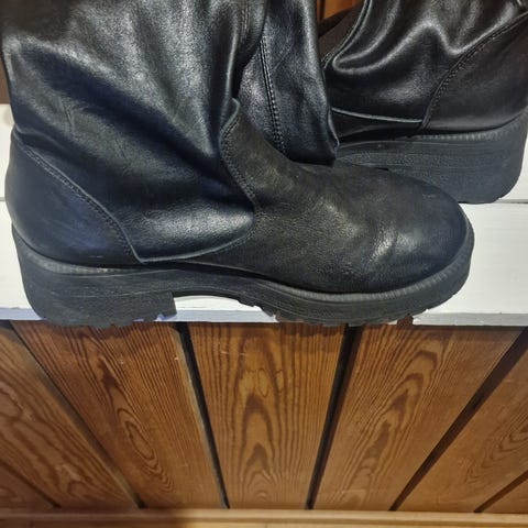Vain sisätiloissa kerran käytetyt saapikkaat. Korko 14 cm, platform 2-2.5 cm. Mitta varren yläreunasta nilkkaan 45.5 cm. Pohje 37.5 cm.