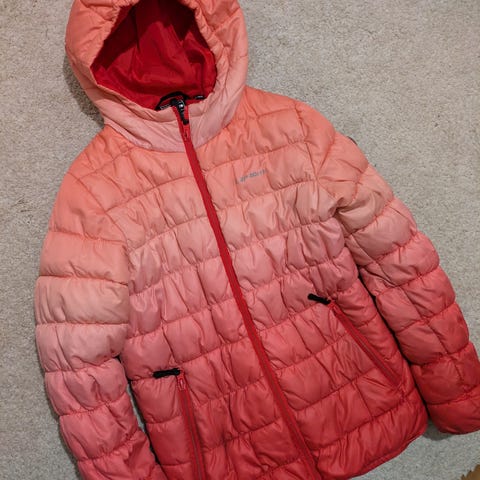 Sininen karvakauluksinen takki kokoa 134 cm, kaksi muuta 140 cm. Käytön jälkiä on, mutta kaikki ovat ehjiä ja käyttökelpoisia.