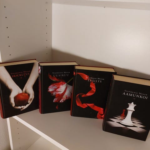 Koko Twilight kirjasarja suomeksi: Houkutus, Uusikuu, Epäilys, Aamunkoi. Kovakantiset kirjat. Siistissä kunnossa.