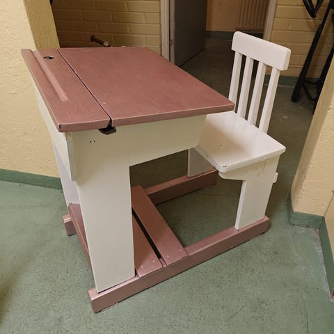 Valkoiseksi maalattu kahdenistuttava pulpetti.