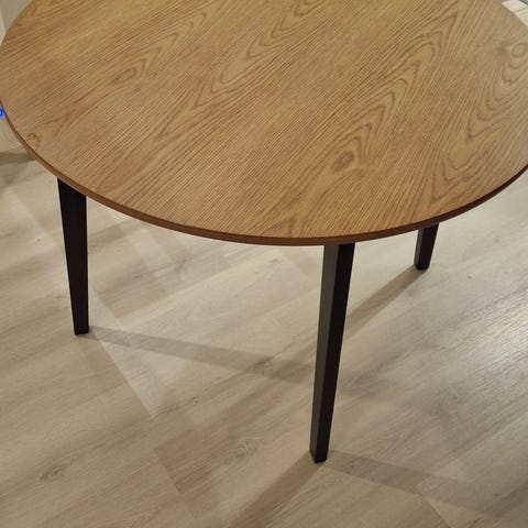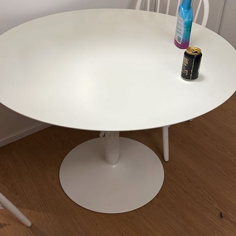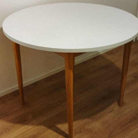 Mintunvihreäksi maalattu (ja lakattu) pöytälevy, jalat maalattu valkoiseksi. Pöytälevy muutoin siisti mutta yhdestä kohtaa hieman maali irronnut (kts. kuva). Pöytä helppo maalata uudestaan mieleisen väriseksi. Jalat kiinni ruuveilla ja on irrotettavissa kuljetusta varten. Pöytä on painava. Vain nouto Koskelasta ennen 13.1.