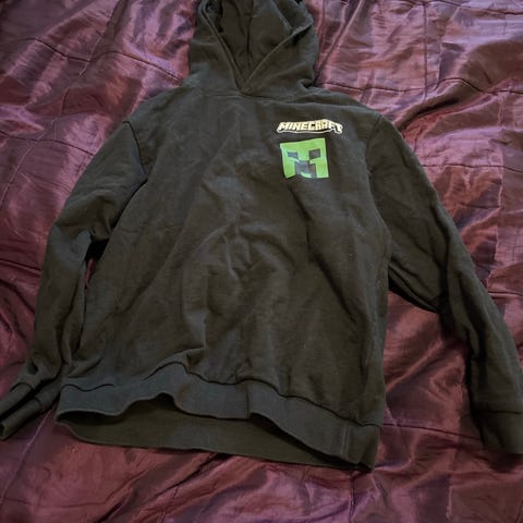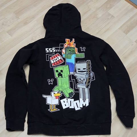 Uusi Minecraft huppari. Käyttämätön mutta laput poistettu. Olikin joululahjan saajalle pieni. Edessä pieni kuva ja takana iso.