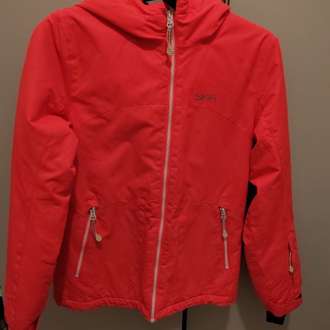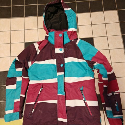 Käytössä ollut sininen poikien toppa-/laskettelutakki. Toisessa hihassa pikkuinen reikä, tullut varmaan nuotiosta tms. Valkoisessa osassa myös tummentumaa. Pienistä vioista huolimatta käyttökelpoinen takki edelleen.