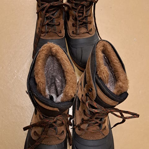 Lontoosta ostetut laadukkaat käsintehdyt talvijalkineet, joissa vetoketju ja nauhakiinnitys. Maksoivat noin 200 €.