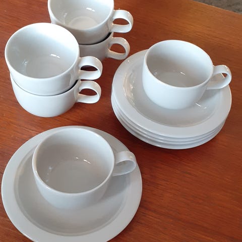 Myydään 4 kpl Arabia Saaristo kahvikuppeja (1,25dl) aluslautasineen ja kakkulautasineen. Hinta kaikille astioille.