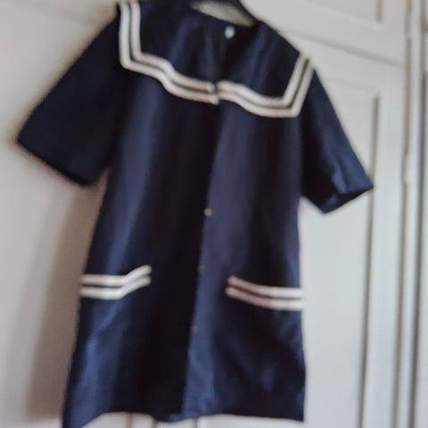 Uudenveroinen laivaston vintagemekko, koko 40. Puuvillaa. Irroitettavat valkoinen kaulus. Upeat vanhat laivaston kullanväriset napit. Mekko levenee helmaan. Taskut edessä. Mukana vyö.