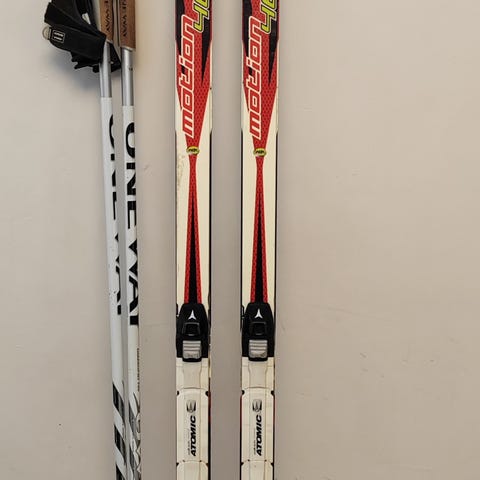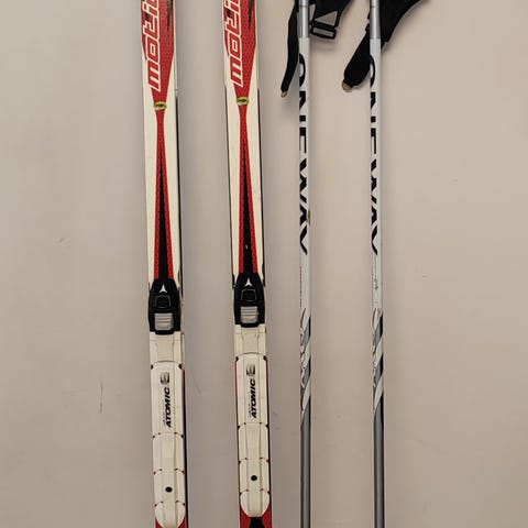 Setti, joka ollut lyhyellä naisella käytössä. Sauvojen kokonaispituus 128 cm päästä päähän ja suksien 180 cm. Monot 39 1/3, vastaa kokoa 38. Setti ollut joitain vuosia vain varastossa säilytyksessä. Nouto Masku Humikkala.