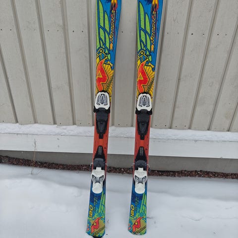 Hyväkuntoiset Nordica laskettelusukset 120cm Marker siteellä.