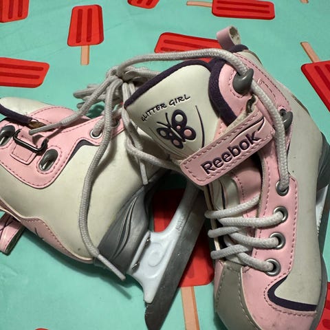 Reebok lasten luistimet, koko 26. Väri vaaleanpunainen ja valkoinen. Siistit. Ehjät ja siistit terät.