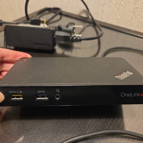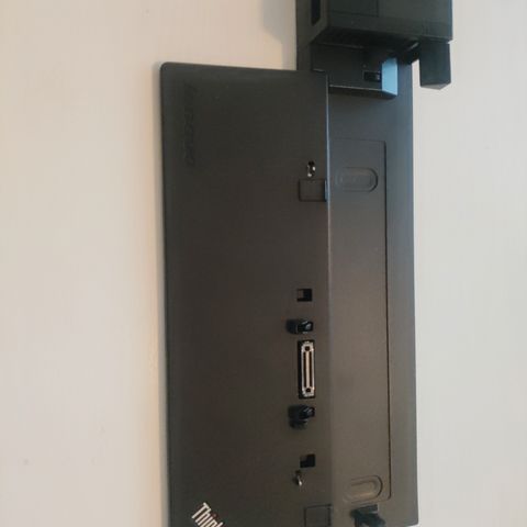 Lenovo ThinkPad telakka, jossa useita liitäntöjä kuten USB-portteja, HDMI, Ethernet ja ääniliitäntä. Laite on musta ja suunniteltu yhteensopivaksi ThinkPad-laitteiden kanssa.