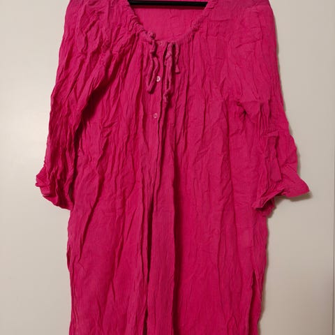 Kevyttä materiaalia, kaunis pinkki kauluspaita 100% viskoosia. Vintage mitoitus, kokolapussa lukee XL mutta pientä mitoitusta.