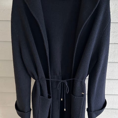 Blaan neulemekko S koossa. Mielestäni reilua kokoa. Käytän yleensä M-koon vaatteita ja minulle on ollut juuri sopiva. Pehmeää merinoa 90%ja vähän Kashmiria 10%. Ei kutita eikä ole käytössä juuri nyppyyntynyt. Pituus hartioista helmaan noin 87cm. Takaa pari cm pidempi. Väri on mielestäni oranssin ja vaaleanpunaisen väliltä.