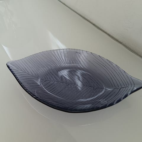 Myydään Pentikin vaalean lila, lasinen tarjoilukulho (pituus n. 30 cm ja leveys n. 16 cm)