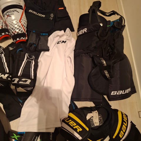 Lasten jääkiekkovarusteita. Noin 6-9 -vuotiaalle. Mukana aluspuku, sukat, (nämä pesua vailla) viiltosuojarannekkeet. Mukaan varsin käytetty vetolaukku. Nouto Pukinmäki.