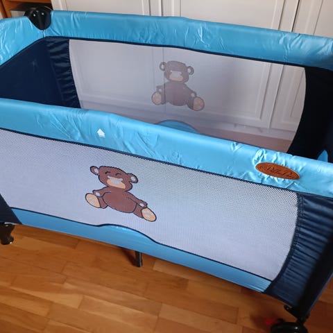 Hyvässä kunnossa oleva Carenan matkasänky. Irroitettavassa pohjalevyssä yksi päädymmäinen levy rikki, mutta se ei haittaa käyttöä.
