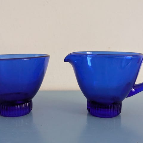 1960-luvun kermakko ja sokerikko vihreää lasia. Kermakossa tarra Kumela Riihimäki.