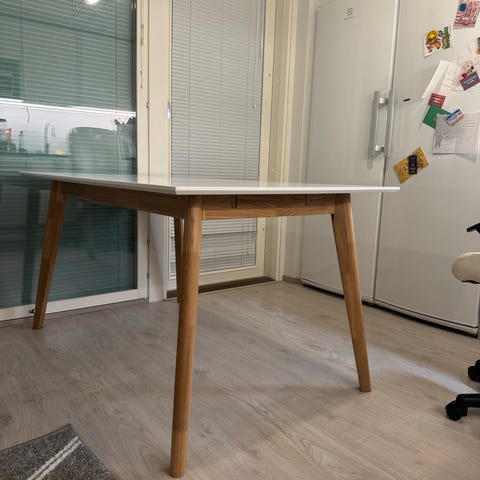 Pöytä on yleisilmeeltään siisti, mutta siinä on normaalia kulumaa ja jälkiä.