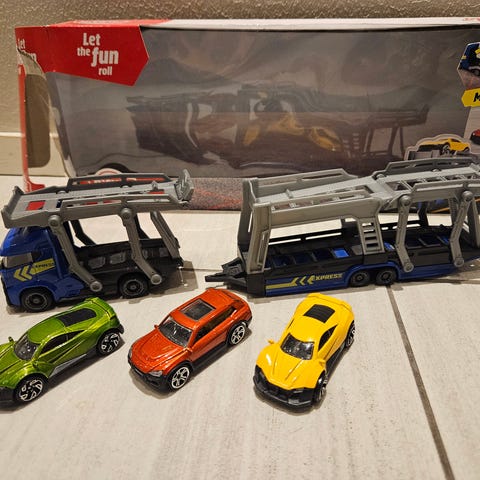 8 autoa mahtuu kyytiin. Mukana tulee yksi auto. Rekassa kantokahva. Edessä autoille liukumäki.