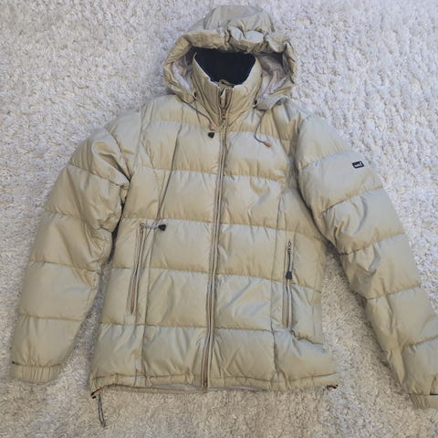 Melkein uudenveroinen laadukas kevyt toppatakki talvenulkoiluihin, miellyttävä päällä ja lämmin kuitenkin kevyt. Huppu, hyvät taskut, kiristysmahdollisuus vyötäröllä ja helmassa.
