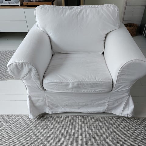 Hyvässä kunnossa oleva valkoinen Ikean Ektorp-nojatuoli. Palvellut noin kolmen vuoden ajan vähäisellä istumisella. Yleisilme siisti ☺️
