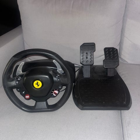 Thrustmaster T80 ferrari-ratti/poljinsetti. Ehjä, toimiva. Pöytälukitus toimii. Väistyivät hyllyyn uudemman tieltä.