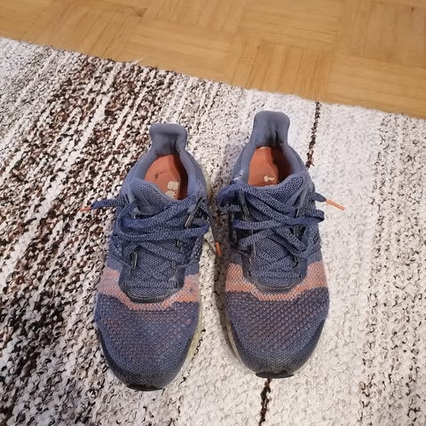 Adidas juoksukengät Adizero SL, värit valkoinen, sininen ja vaaleanpunainen. Olleet noin 7 kk käytössä lapsella. Muuten hyvä kunto, mutta suuaukoissa sisäsyrjän puolella pienet kulumat (näistä viimeinen kuva).