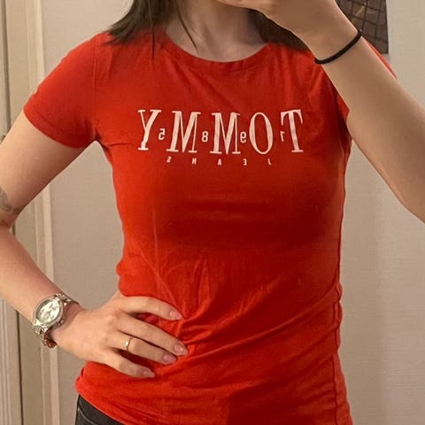 Pirteän oranssi TH t-paita, jonka sain tuliaisina Jenkeistä. Väri ei kuitenkaan osunut itselleni ihan nappiin, joten laitetaan uusi paita kiertoon. Materiaali miellyttävää 100% puuvillatrikoota.