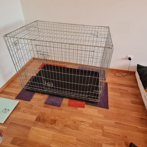 Inclined steel cage for dogs in very good condition for sale, barely used for six months. I sell as I just don't need it at home as originally thought. Dimensions: 92.5x57.5x65.5cm, XL, original price: 130 €