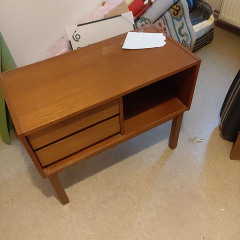 Aito 70-luvun lipasto, väriltään valkoinen, jossa on kaksi laatikkoa. Pöytä on tarkoitettu makuuhuonekäyttöön ja tarjoaa säilytystilaa pienille esineille. Vaatii uudelleen maalausta. Nouto Helsinki, mobilepay tai käteinen.