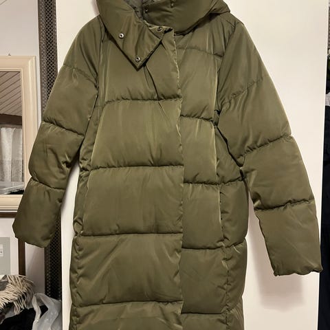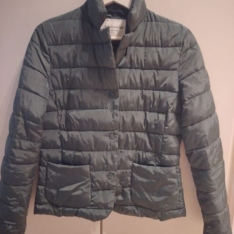 Naisten toppatakki koossa M. Päällykangas vahvaa puuvillaa, jossa pientä käytön tuomaa kulumaa, mutta takki ehjä. Hupun sisäpinnassa pehmeä teddykarva. Vyötäröstä kiristysnauha takana, hihansuissa resorit.