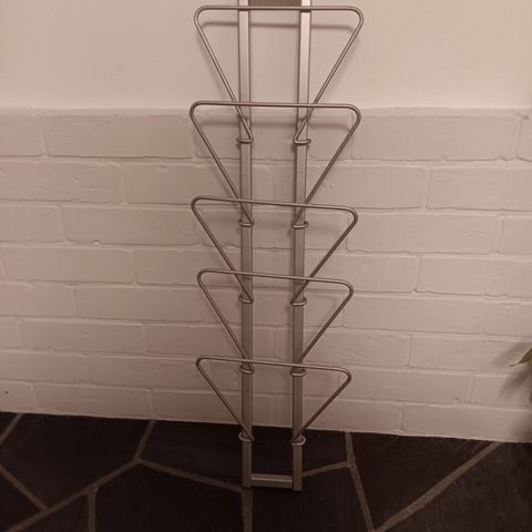 Valkoinen muovinen lehtiteline. Mitat noin leveys 30 cm, korkeus 35 cm.