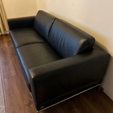 Hyväkuntoinen 3 istuttava nahka sohva, puurunkoinen. Toki käytön jälkeä löytyy. Kevyt siirrellä.
