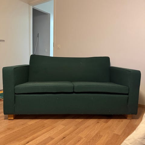 Artek Kiki 2-istuttava sohva, väri vihreä. Teräsrunko ja kangasverhoilu. Kankaassa pientä kulumaa, mutta yleisesti hyvässä kunnossa.