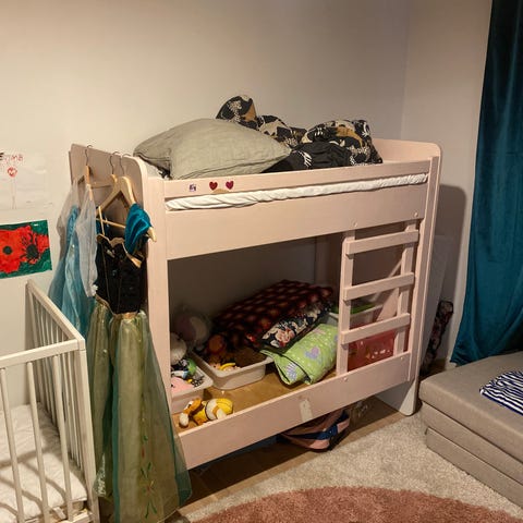 Hyvässä kunnossa oleva lasten täyspuinen kerrossänky. Mitat 85*205, tikkaiden kohdalta leveämpi. Mukaan kuuluu vuodevaatelaatikko/lisävuode.