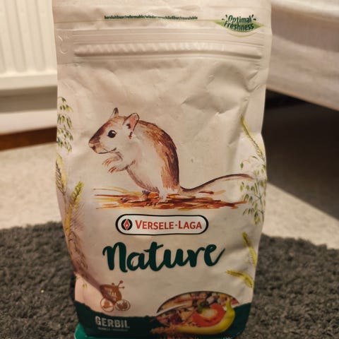 Kaksi 600g avaamatonta pussia gerbiilinruokaa. Päiväys 11/25, mutta tämä ei haittaa käyttöä.