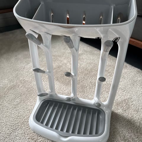 Boon vauvan pullojen kuivausalusta. ”Ruohikkoon” saa pullot laitettua pystyyn kuivumaan ja alla on veden keräysastia