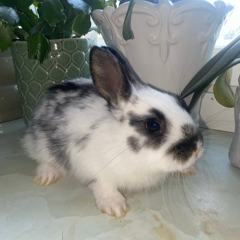 Kaninungar födda 16.11, 7 stycken. Pappa renrasig rex, svart med brun skiftning. Mamma blandras, vit med beige teckning på ryggen, ljusröda öron och blå ögon.