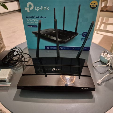 TP-Link Archer C50 Reititin, AC1200 Wireless Dual Band, sisältää virtalähteen ja Ethernet-kaapelin. Sopii kotikäyttöön langattoman verkon jakamiseen.