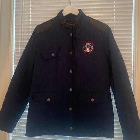Lexington ihana tikkitakki. Pidempi malli. Tummansininen. Koko XS. Kai-kai n. 46cm, olka-helma n. 83cm.