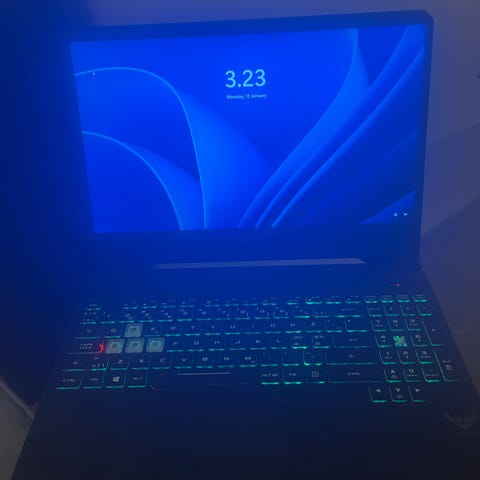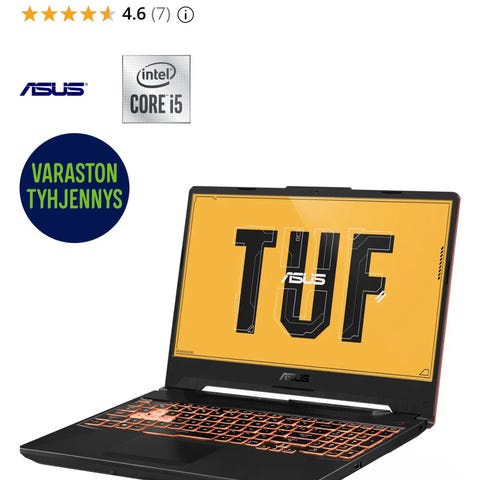 Asus TUF Gaming kannettava tietokone, joka on suunniteltu pelaamiseen ja monipuoliseen käyttöön. Laite sisältää integroidun näppäimistön ja näytön, ja se on valmistettu kestävistä materiaaleista.