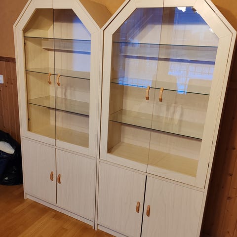 Hieno vitriinikaappi valkoinen.myös seinään kiinnittimet.eli vuäitriini kaappi jonka saa myös seinälle.
