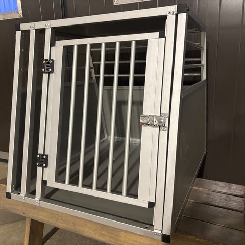 Iso ja tilava koirahäkki. Ala laita hieman taipunut sisäänpäin (kts. kuva), muutoin ehjä. Menee kasaan.