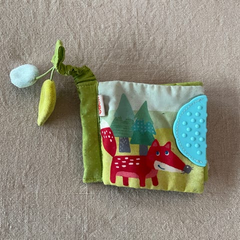 Pehmeä ja rapiseva aktiviteettikirja, jossa on eläinhahmoja.