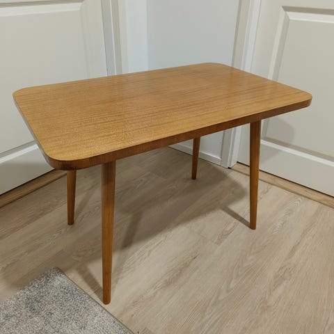 Vanha tanskalainen tiikkinen sivupöytä. Oletettavasti pienin kolmen sarjapöydän setistä. Google lensin mukaan Svend Åge Madsenin suunnittelena. Erittäin hyvin säilynyt yksilö.