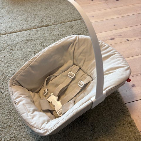 Stokke Nomi Newborn setti mustana ja lelukaari. Pehmusta harmaa/sininen. Vauvan kaukalo, pehmuste ja lelukaari. Ei sisällä itse Nomi jalkaa.